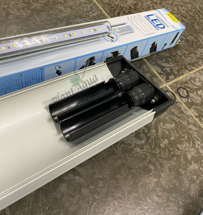 При помощи переходников модули Tetra были установлены вместо стандартных ламп. И тут нас ждал приятный сюрприз. Оказалось, что светящаяся часть у данных трубок точно соответствует светящейся части старых ламп, а значит, наш аквариум будет освещен по всей длине без затененных зон, что очень важно для аквариумов с большим количеством разнообразных растений.