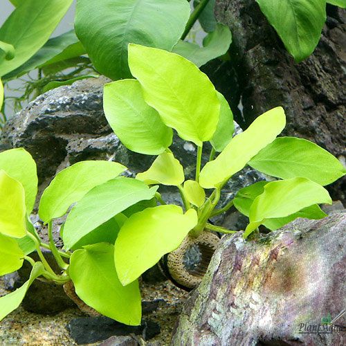 Анубиас нана голден (Anubias barteri var. nana "Golden") - жестколистное карликовое растение с округлыми глянцевыми листьями приятного золотисто-зеленого цвета.