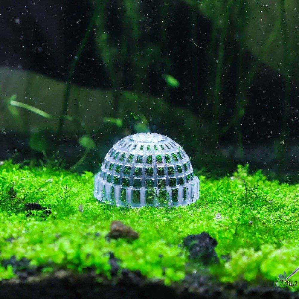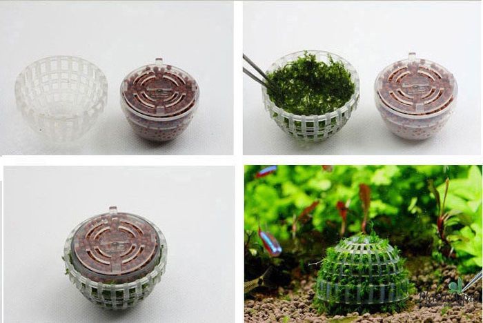 Декорация для акваскейпа легка в установке и удалению из аквариума. Для удобного использования декорации, сетка имеет резьбовое соединение с контейнером для надежной фиксации. Чтобы создать украшение, вам потребуется уложить мох в сетку полусферу, привинтить ее к контейнеру с минеральными шариками и установить ее в аквариуме. Через некоторое время при правильных условиях содержания ваша декорация обрастет мхом и предаст вашему аквариуму невероятный природный пейзаж. Для создания декора отлично подойдет яванский или рождественский мох, которые имеет способность быстро разрастаться, но также можно использовать и другие водные растения.