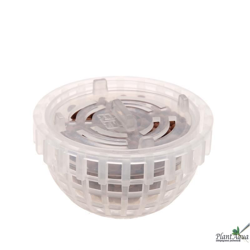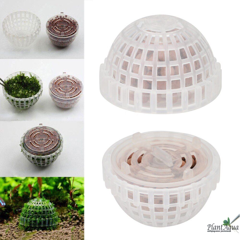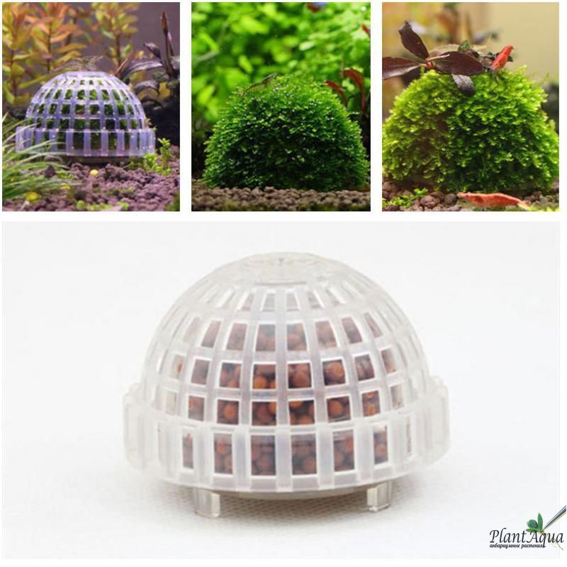 Декорация для мха Moss Ball (полусфера) - декорация для аквариума в виде полусферы для аквариумного мха. Используется для создания природных пейзажей в акваскейпе, а так же для создания укрытий для креветок и рыб. Изготовлена декорация из прозрачного высококачественного пластика, который не выделяет в воду вредных веществ и не меняет ее параметры. Украшение состоит из сетки в виде полусферы и контейнера с натуральными минеральными шариками.
