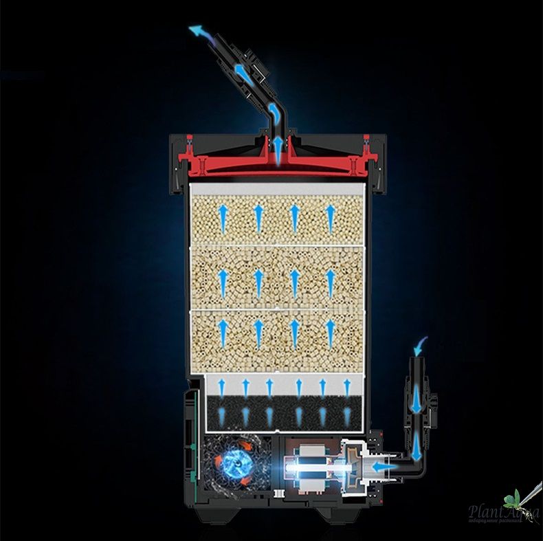 Благодаря панели на передней части фильтра можно регулировать производительность фильтра в промежутке от 500 до 1500 л/ч. 10 ступеней регулировки с преобразованием частоты позволяет точно задать необходимую производительность для выбранного аквариума без потери функциональности фильтра.