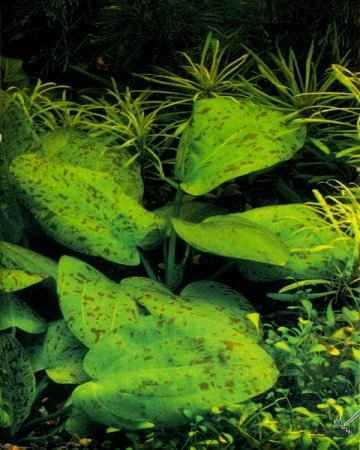 Эхинодорус Шлютера (Echinodorus schlueteri) - розеточное растение среднего и заднего плана аквариума с листьями зеленого оттенка. Растение ярко окрашено даже при среднем освещении. Отличительной особенностью является то, что на молодых листьях имеются темные пятна, которые остаются видимыми и на старых листьях, хотя не так контрастно.