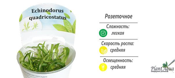 Эхинодорус квадрикостатус (Echinodorus quadricostatus) — один из самых компактных и неприхотливых видов эхинодорусов, идеально подходящий для оформления переднего и среднего плана аквариума. Родом из тропических водоёмов Южной Америки (Бразилия, Колумбия, Венесуэла), он ценится за быстрый рост, густую розетку и способность образовывать живописные «газоны» из мелких листьев.