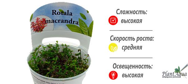 Обязательными условиями для того, чтобы ротала макрандра достигла своего красивого красного цвета являются внесение СО2 и микроэлементов, мощное освещение, мягкая вода и температура воды не выше 25 градусов. При соблюдений этих условий — ротала может стать настоящей изюминкой аквариума и не зря в иностранной литературе ее часто называют “king of the reds”.